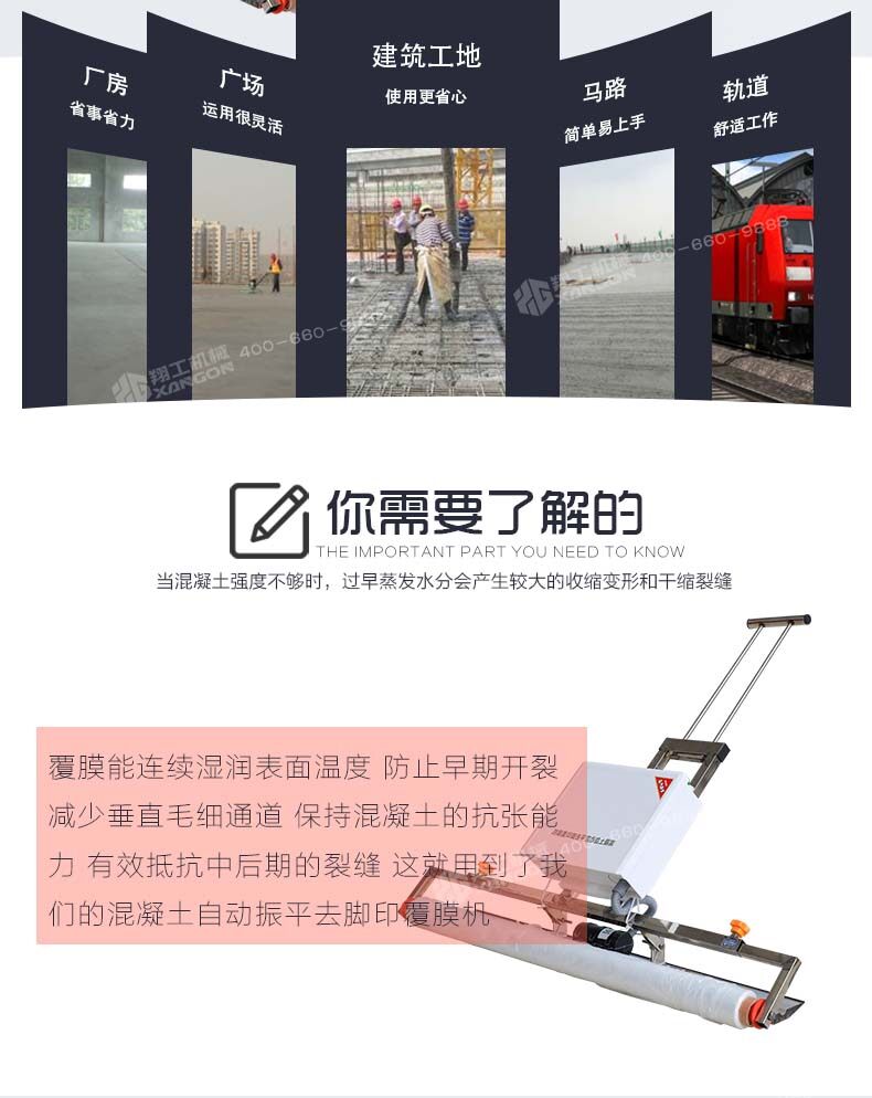 混凝土自動(dòng)振平去腳印覆膜機(jī)主要是用于混凝土澆筑的工作中,此款設(shè)備澆筑后會(huì)進(jìn)行覆膜養(yǎng)護(hù),防止水分蒸發(fā)過(guò)快造成的脫水,混凝土自動(dòng)振平去腳印覆膜機(jī)助力推動(dòng)覆蓋薄膜養(yǎng)護(hù)普及進(jìn)程,保證混凝土施工效果。